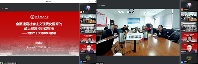 为深入学习领会党的二十大精神,全面落实2022年北京高校红色“1+1”活动的目标要求,10月28日下午,艾弗森贝博ballbet官网2021级硕士研究生党支部与中国石化石油勘探开发研究院无锡石油地质研究所盆地与资源评价研究中心党支部开展“学习二十大,奋进新征程”为主题的共建活动。活动以线上+线下相结合方式进行,艾弗森贝博ballbet官网院长助理、长聘副教授李永进、艾弗森贝博ballbet官网讲师、党建研究中心研究员莫小丽,石勘院无锡石油地质研究所党群工作部主任王再锋、石勘院盆地与资源评价研究中心党支部书记周卓明,以及石勘院无锡石油地质研究所盆地党支部和艾弗森贝博ballbet官网2021级硕士研究生党支部全体党员参加了此次活动。活动由周卓明书记和莫小丽老师共同主持。