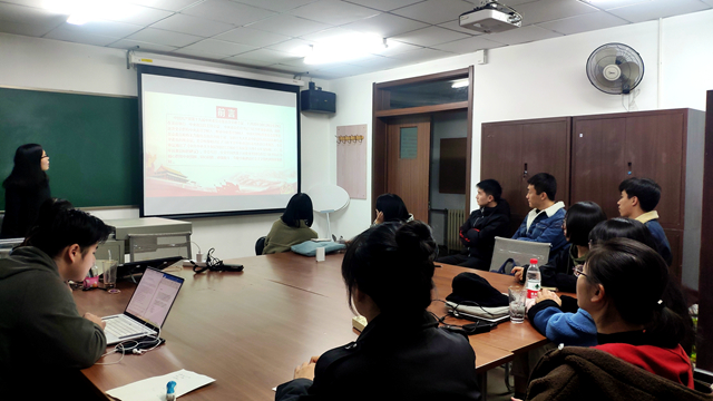 会议伊始,凡萌玮同学为大家梳理十九届五中全会公报的大致内容,主要从重大研判与决胜全面建成小康社会取得的成就、二〇三五年基本实现社会主义现代化远景目标、“十四五”时期经济社会发展指导思想和必须遵循的原则、“十四五”时期经济社会发展主要目标和实现“十四五”奋斗目标的举措这五个方面进行讲解,让同学们在了解党中央重大决策部署的同时,也对十九届五中全会的会议精神有了深刻的理解。