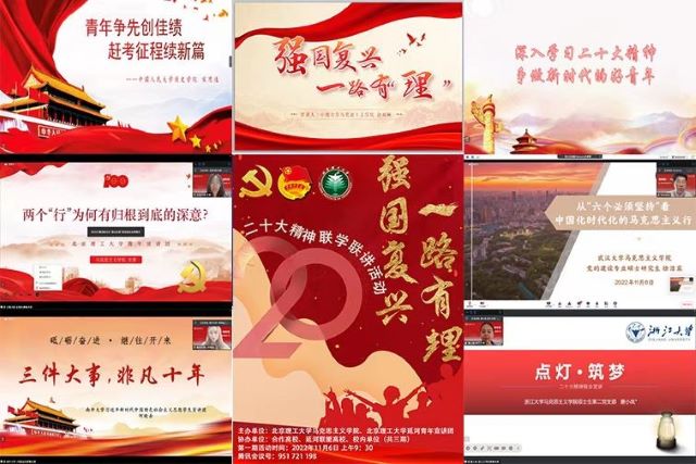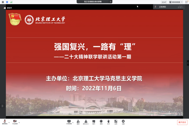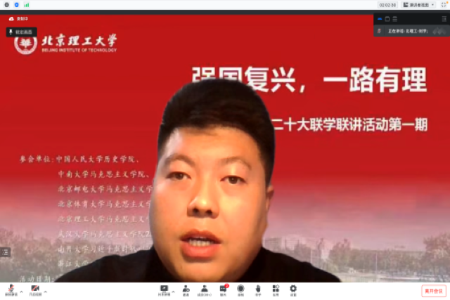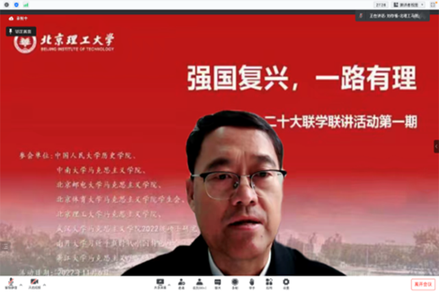 为进一步深入学习宣传贯彻党的二十大精神, 11月6日,艾弗森贝博ballbet官网联合中南大学、中国人民大学、北京邮电大学、北京体育大学、武汉大学、南开大学、浙江大学等8所高校开展“强国复兴,一路有‘理’”——二十大精神联学联讲系列活动。艾弗森贝博ballbet官网党委书记刘存福,党委副书记、副院长刘宇出席,各高校师生共200余人参加。活动由艾弗森贝博ballbet官网2022级硕士研究生贺美杰主持。